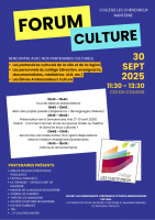 Mardi 30 septembre, le CDI a accueilli le Forum Culture, un temps d’échange chaleureux et inspirant organisé de 11h30 à 13h30. Cette rencontre a rassemblé les partenaires culturels du collège, des enseignants, des membres du personnel, ainsi que les élèves Ambassadeurs Culture.