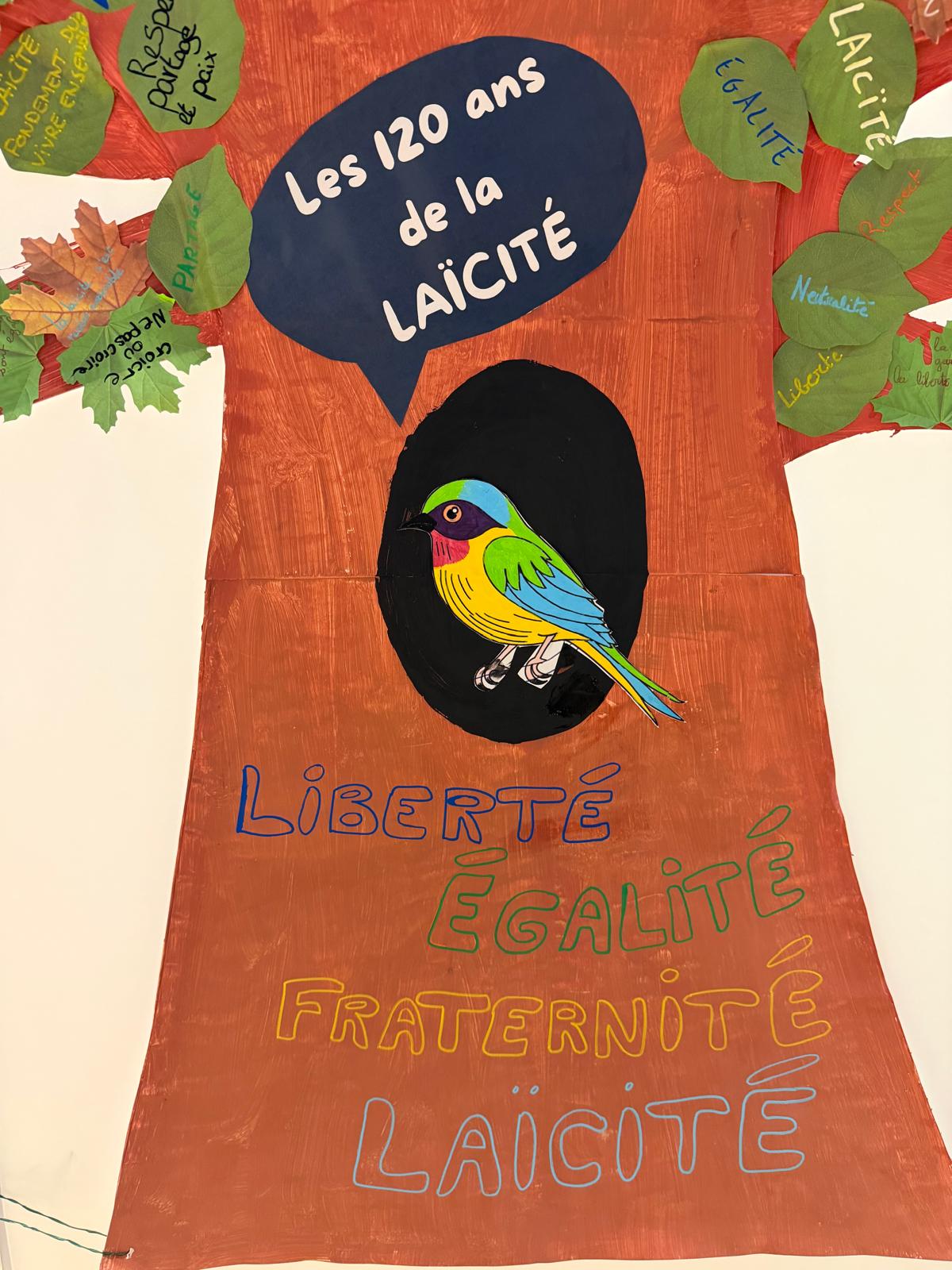 Accompagnés par la Conseillère Principale d’Éducation, Mme Charles, les élèves ont imaginé et réalisé un Arbre de la Laïcité. Ce projet pédagogique avait pour objectif de permettre aux élèves de réfléchir collectivement aux principes qui garantissent le vivre-ensemble au sein de l’École de la République.