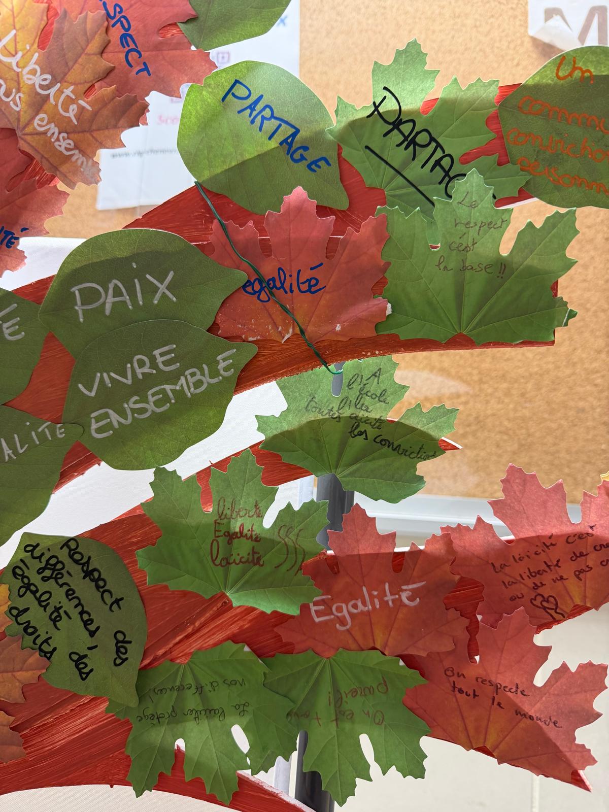 Chaque feuille de l’arbre représente une valeur essentielle portée par la laïcité : le respect, la tolérance, la liberté de conscience, l’égalité ou encore la fraternité. À travers cette création, les élèves ont pu exprimer leur compréhension de ce principe fondamental et prendre conscience de son importance dans leur quotidien au collège.
