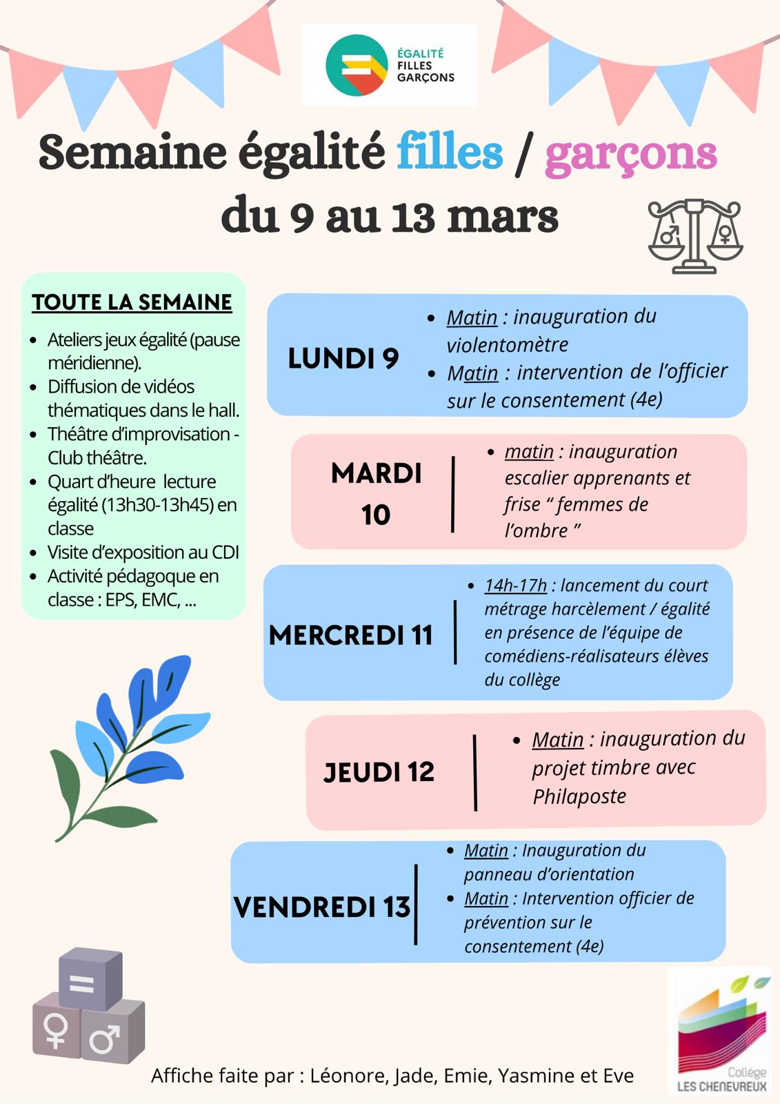 Nous remercions chaleureusement les élèves engagés dans le Club Égalité, à l’origine de l’affiche de cette semaine, pour leur investissement et leur créativité, ainsi que l’ensemble des personnels et partenaires mobilisés pour la réussite de ce projet.